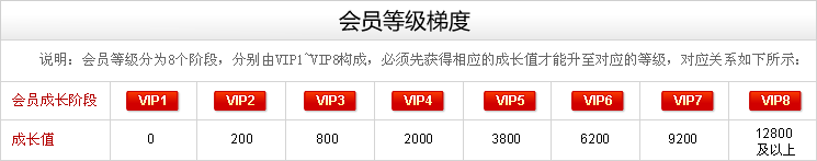 会员成长等级分为八个梯度,从VIP1开始,随着成长值的不断累积,等级越高,特权越丰富,身份越尊贵。