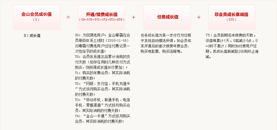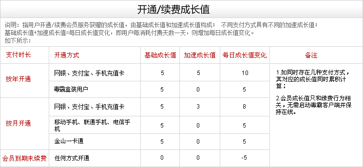 即某用户选择某支付方式开通或续费金山会员,其会员成长值=付费天数*每日成长值变化。具体对应关系如下: